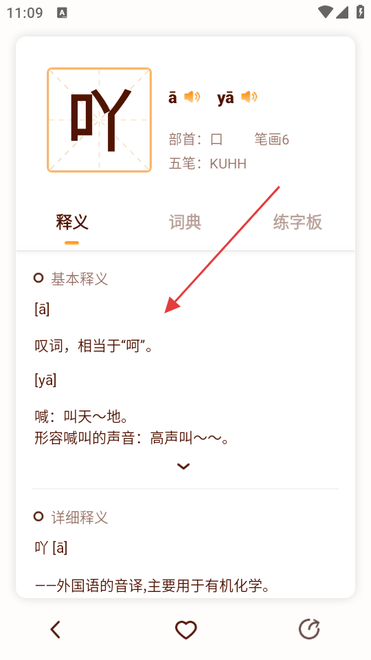 4、点击选中的字词后,可查看其释义,包括基本释义和详细释义等内容。