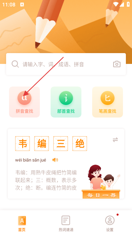 2、进入软件首页后,点击【拼音查找】功能入口,可通过拼音查询字词。