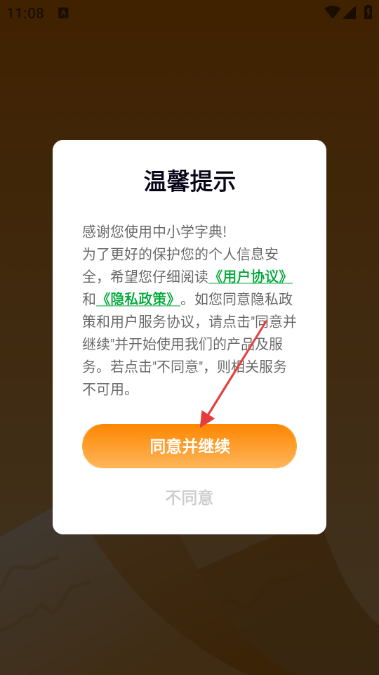 1、在温馨提示页面,点击【同意并继续】,即可开始使用该软件。