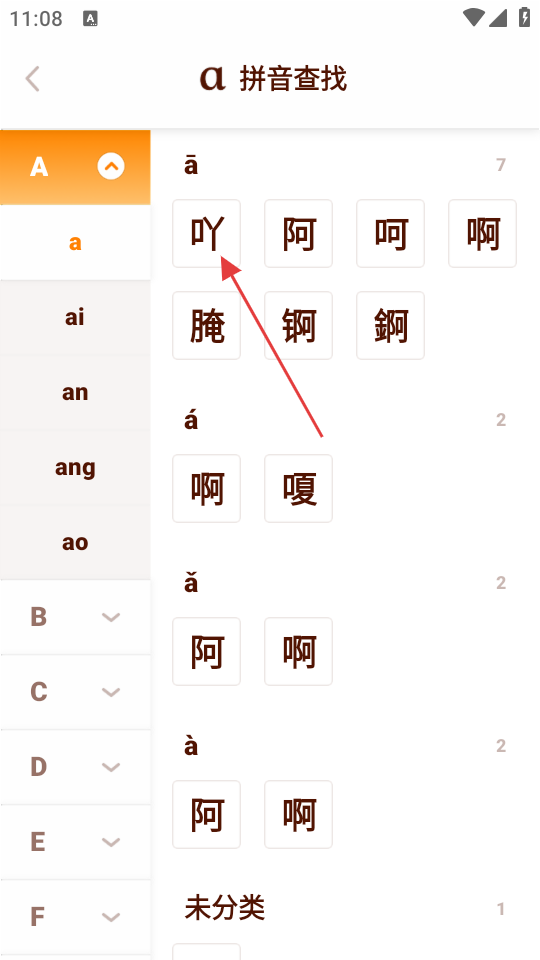 3、在【拼音查找】页面,选择对应拼音下的字词,如“吖”,可查看该字词的详细信息。