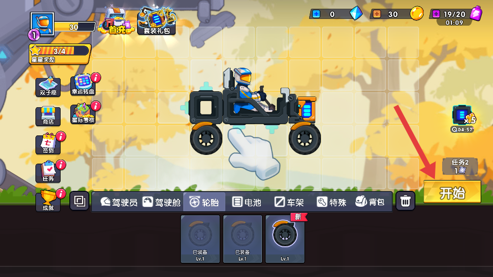 1、在车辆组装界面,可选择轮胎等部件进行组装,组装完成后点击“开始”按钮进入游戏,开始驾驶挑战。