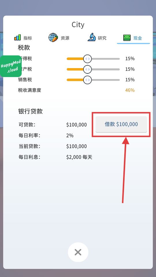 1、在现金界面,依据可贷金额与日利率,合理使用【借款$100,000】功能,获取资金助力城市建设。
