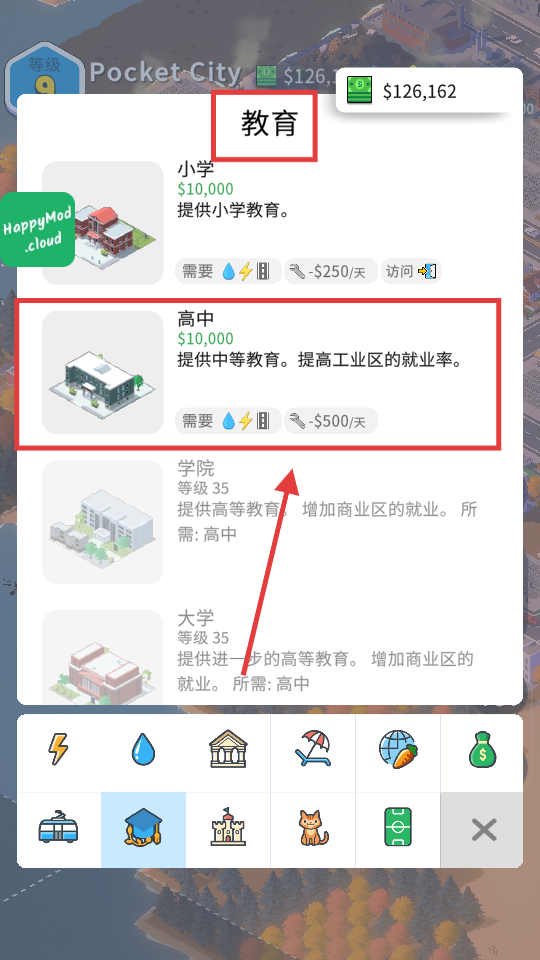 2、在教育建筑栏,建造【高中】,花费【$10,000】,提供中等教育,提高工业区就业率,为后续解锁铺垫。
