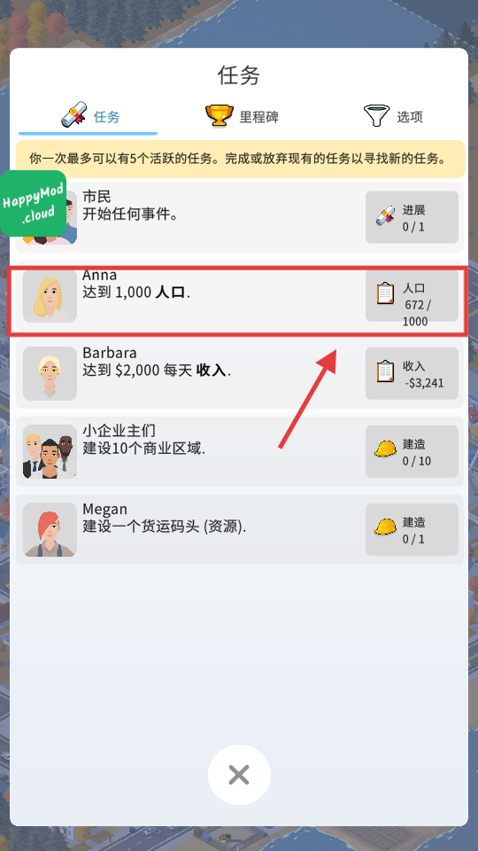 3、完成Anna的【达到1,000人口】任务,需规划住宅、公共设施,改善生活,吸引人口增长至目标。