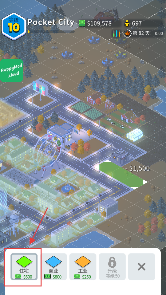 4、点击【住宅】按钮,花费【$500】建造住宅,增加城市人口,提升税收,助力城市发展。