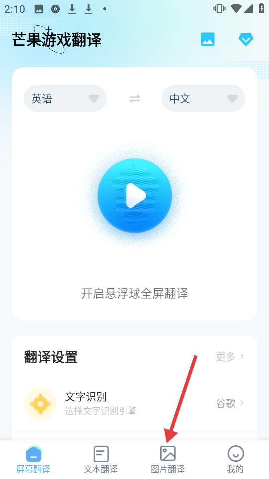 1、在“芒果游戏翻译”应用底部点击【图片翻译】选项,进入图片翻译功能页面。