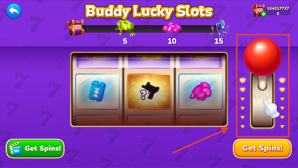 1、在【BuddyLuckySlots】界面,点击拉杆转老虎机得道具,或点【GetSpins】看广告获spin。