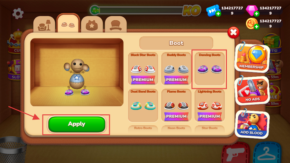 2、在服装界面选【DancingBoots】,点击【Apply】给木偶换装,改变外观或提升能力。