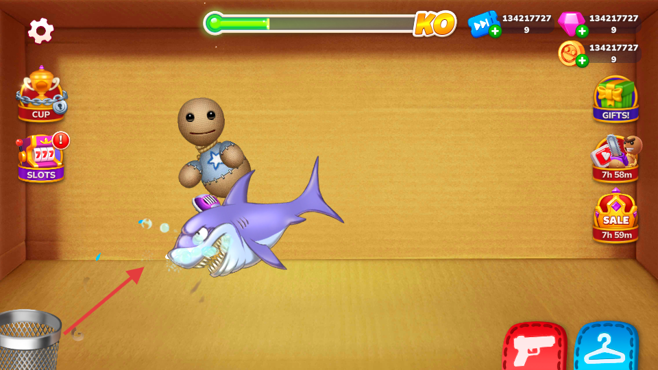 3、操控鲨鱼道具攻击木偶,借特效造成伤害,积累【KO】进度,获取金币。
