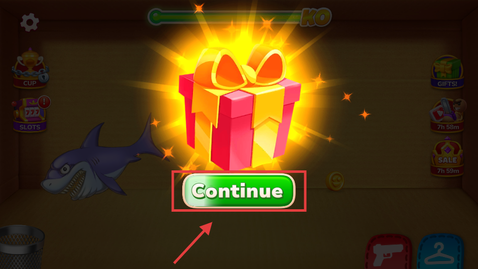 4、ko后出礼物盒,点击【Continue】领奖励,继续游戏或解锁新内容。