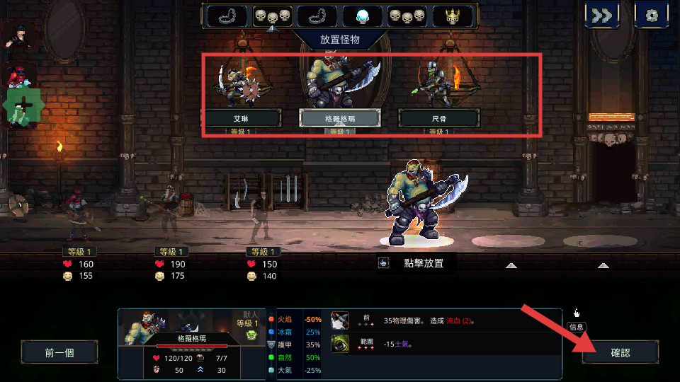 3、放置怪物,如艾瑞、格罗终焉、尺骨,点击【确认】,布置战斗单位,迎战敌人。
