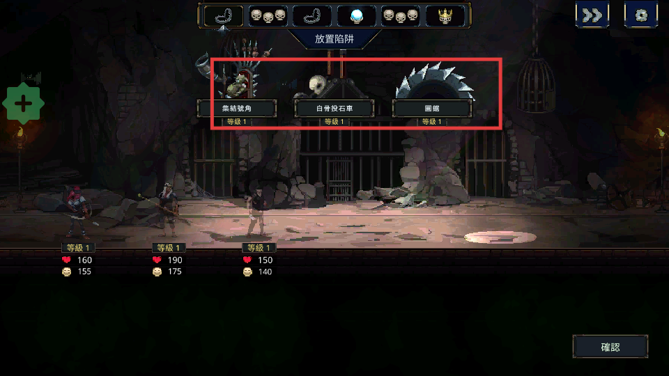 2、放置陷阱,如集结号角、白骨投石车、圆锯,布置防御,阻击敌人进攻。