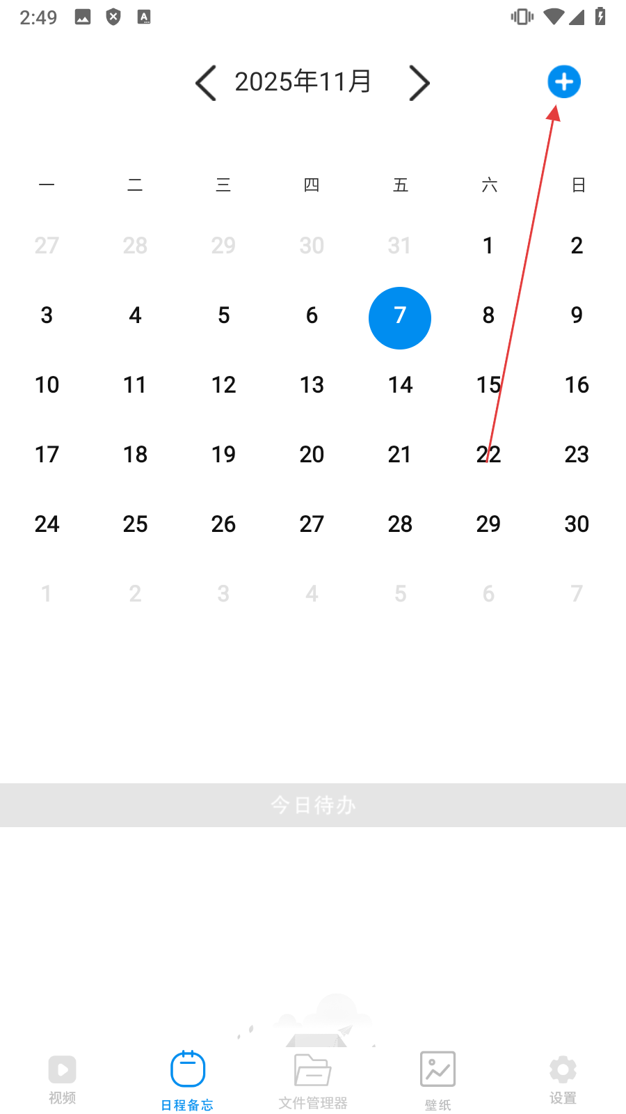 2、在日历页面,点击右上角【+】号,进入添加日程页面。
