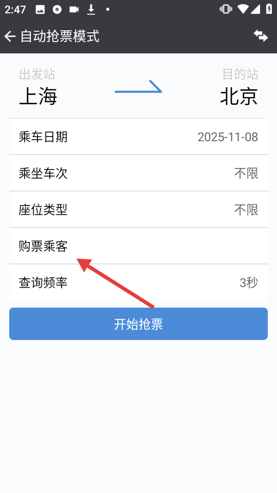 3、在自动抢票模式页面,设置出发站、目的站、乘车日期等信息,然后点击【购票乘客】。
