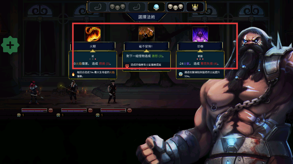 1、选择法术,如火鞭、毫不留情、恐怖,提升战斗能力。