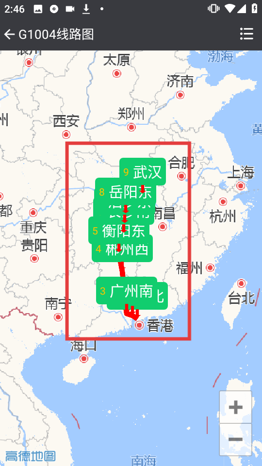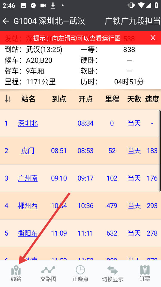 3、在G1004车次详情页面,点击底部【线路】按钮,即可查看该车次的线路图。