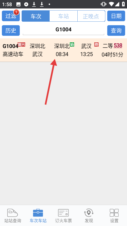 4、在查询结果中找到G1004车次,点击进入其详情页面。