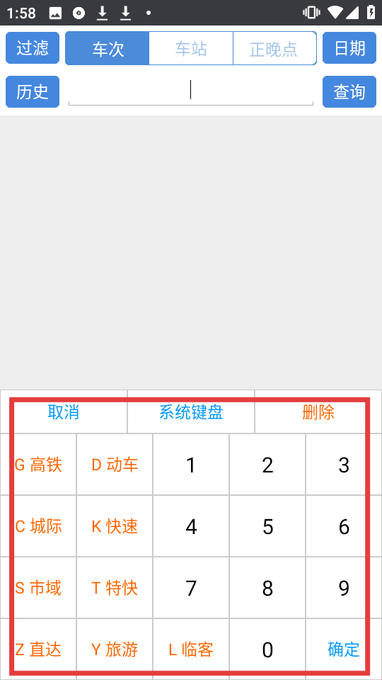 1、在车次查询界面,选择对应车次类型(如G高铁),输入车次号(如G1004),点击【查询】。