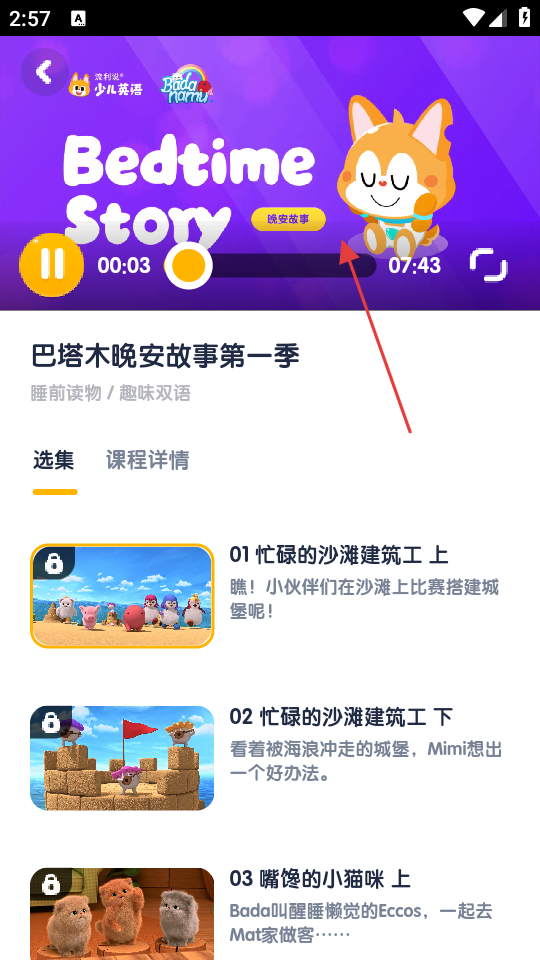 3、在晚安故事页面,点击今日推荐的【忙碌的沙滩建筑工】故事,进入故事播放页面。