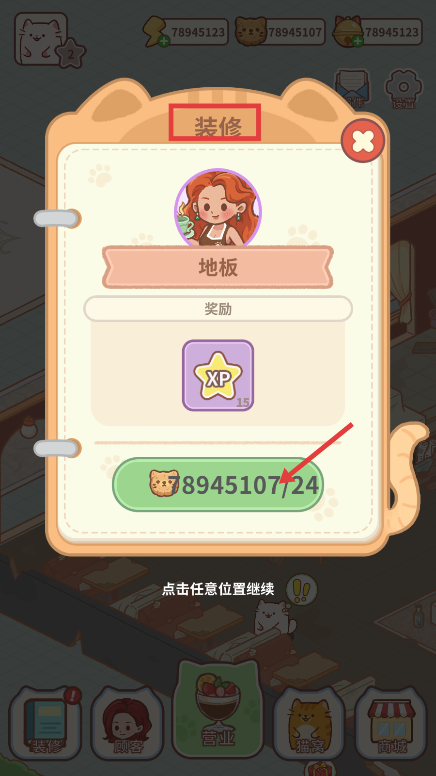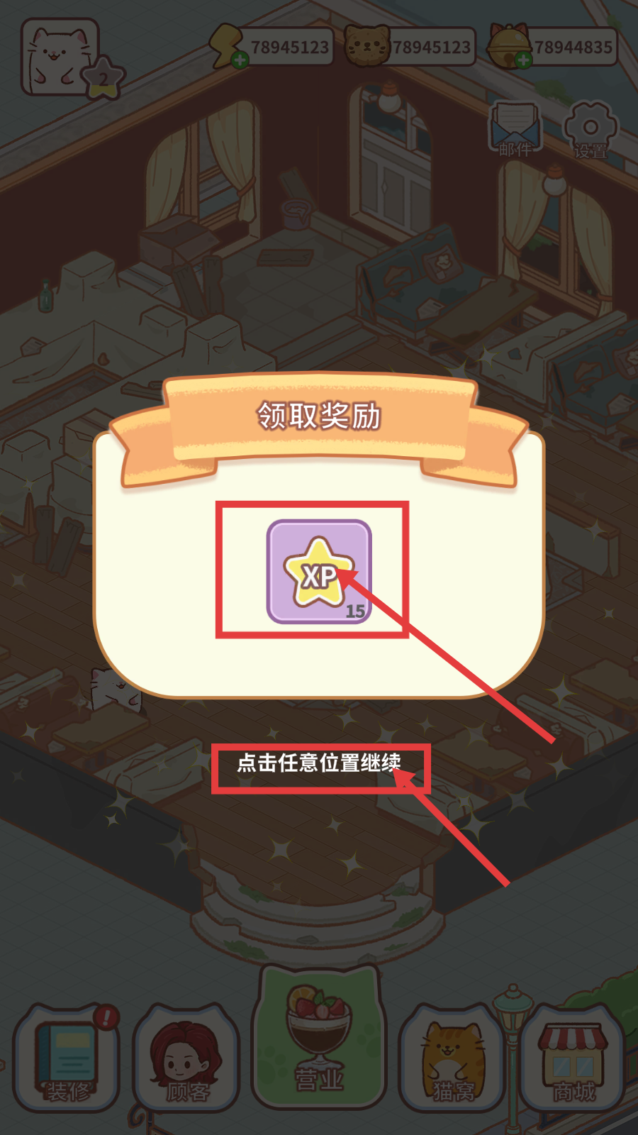 4、装修完成后,领取经验奖励(15XP),提升餐厅等级,为后续装修或营业内容奠定基础。