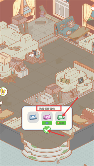 3、在“选择餐厅装修”界面,根据自身饼干资源选择合适的装修风格(如绿色风格消耗288饼干),点击确认按钮应用装修。