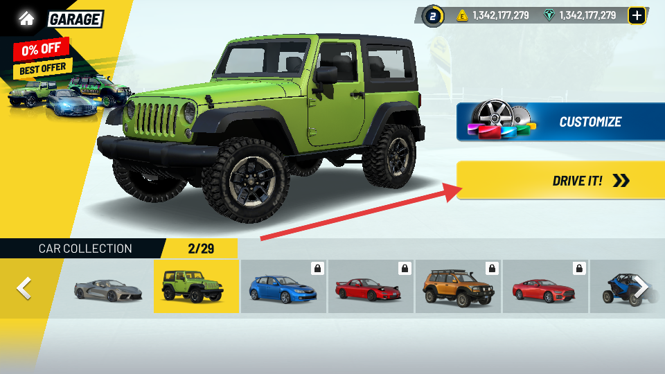 2、在车库界面,可查看已收集的车辆,如绿色吉普车,点击“DRIVEIT!”按钮驾驶该车辆。