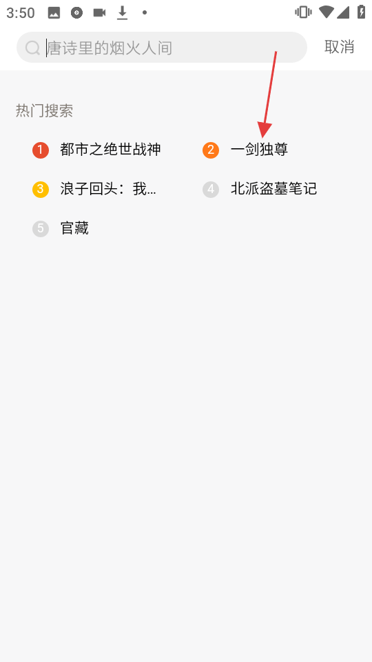 2、在搜索页面,点击热门搜索中的“一剑独尊”进入书籍详情页。