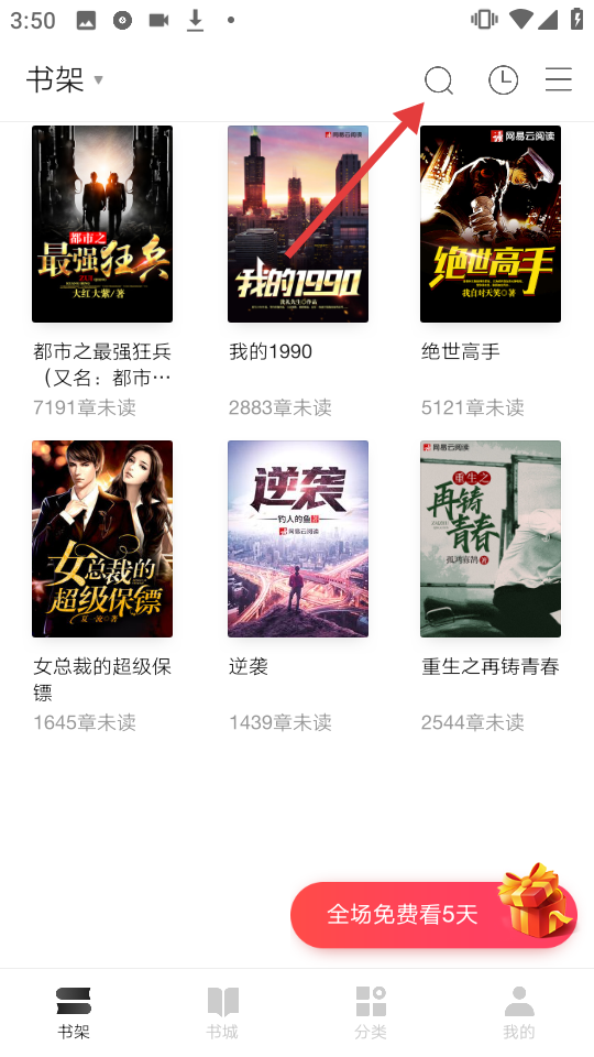 1、在阅读书架界面,点击右上角搜索图标进入搜索页面。