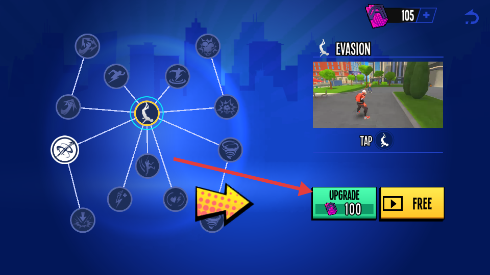1、在技能升级界面,可消耗资源升级“躲避”等技能,点击按钮消耗100资源提升技能效果。