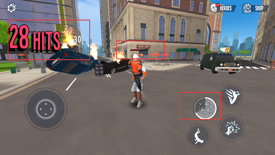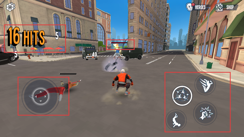2、战斗中利用左侧虚拟摇杆控制角色移动,右侧的技能按钮释放不同招式,连击数(HITS)会显示在左侧。