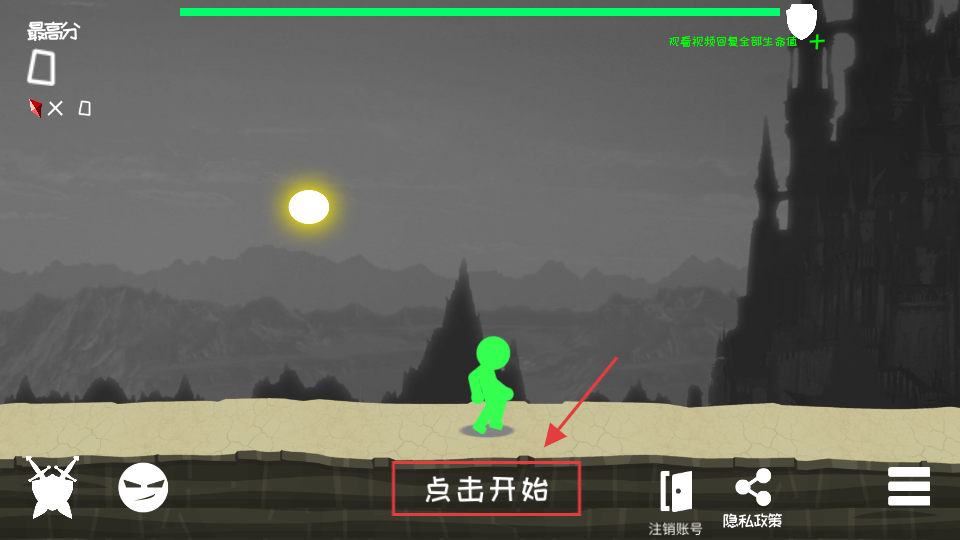 1、点击【点击开始】按钮,即可操控【绿色】小人,开启射击格斗闯关之旅。