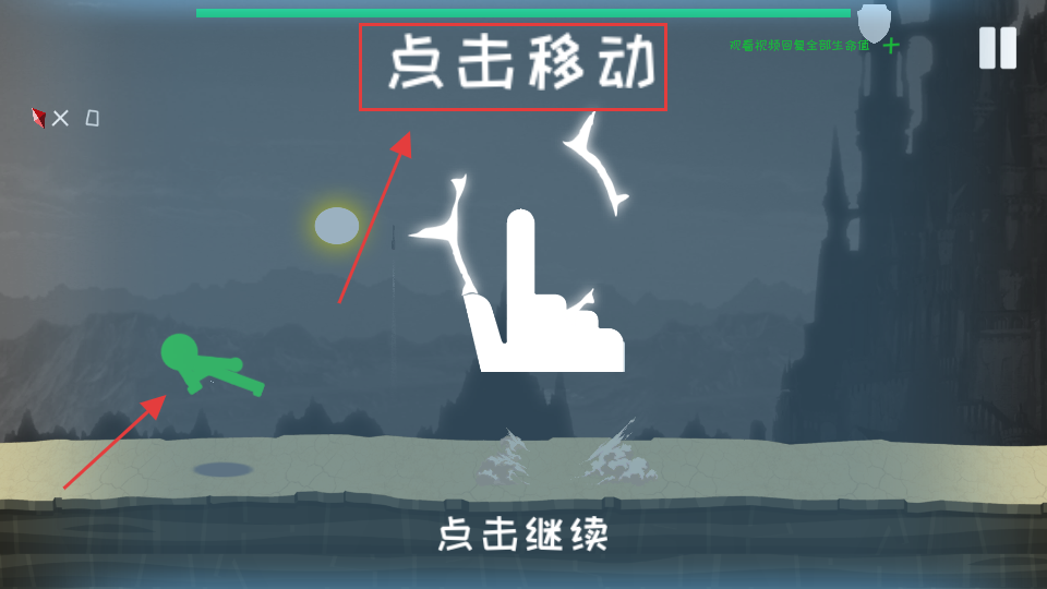 2、根据【点击移动】提示学习操作,点击【点击继续】,进入实战环节体验射箭格斗。
