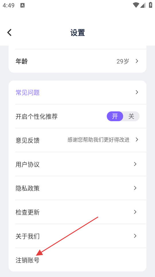 3、在设置页面中,点击【注销账号】选项,弹出注销账号确认弹窗。