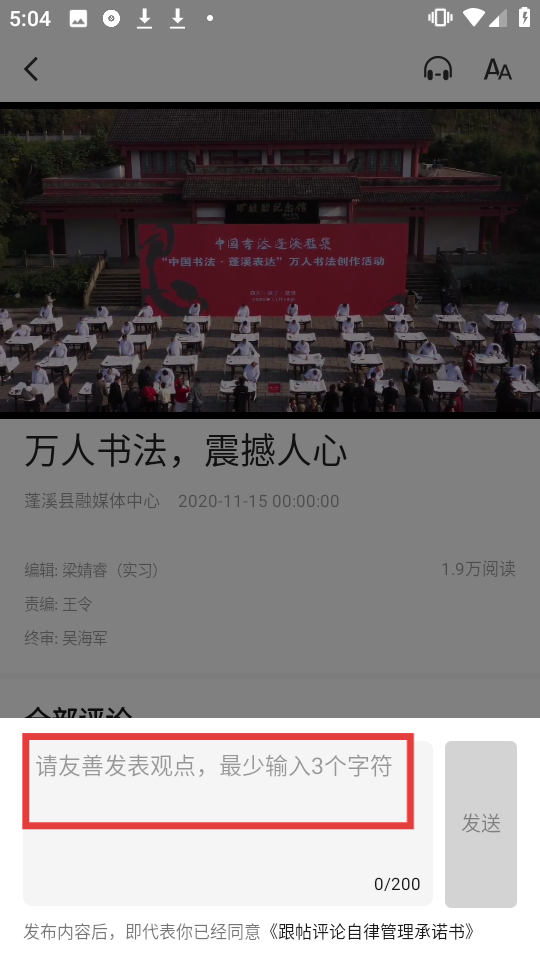 4、在评论输入框中输入至少3个字符的观点,然后点击发送。