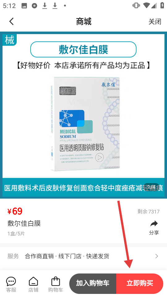 3、在敷尔佳白膜详情页点击【立即购买】按钮。