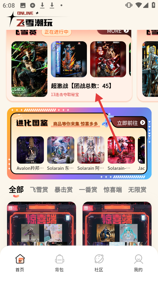 1、在飞雪潮玩首页,点击超激战【团战总数:45】可进入团战活动页面。