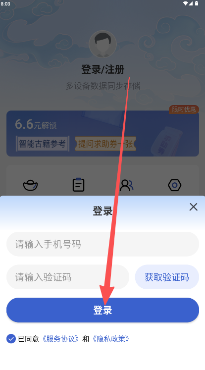 1、在界面输入手机号码与验证码后,勾选同意服务协议,点击“登录”按钮。