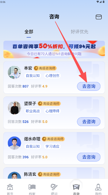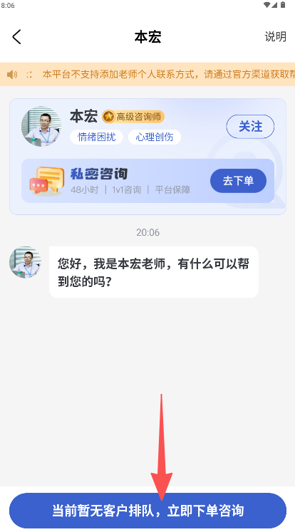 3、选择目标咨询师如“本宏”,点击底部“立即下单咨询”发起咨询。