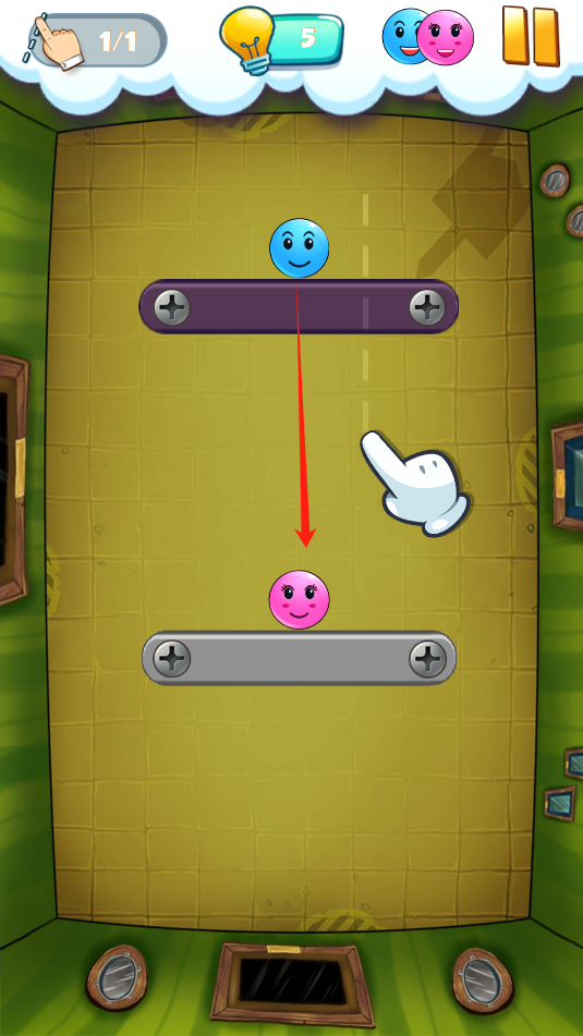 3、游戏中,点击上面的蓝色球与粉色球相连接,蓝色球可切断中间的阻隔。