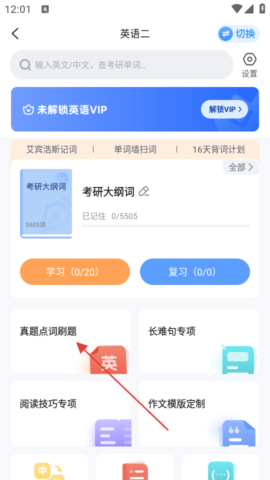 2、在英语二学习板块中,点击【真题点词刷题】选项,进入英语二历年真题刷题页面。