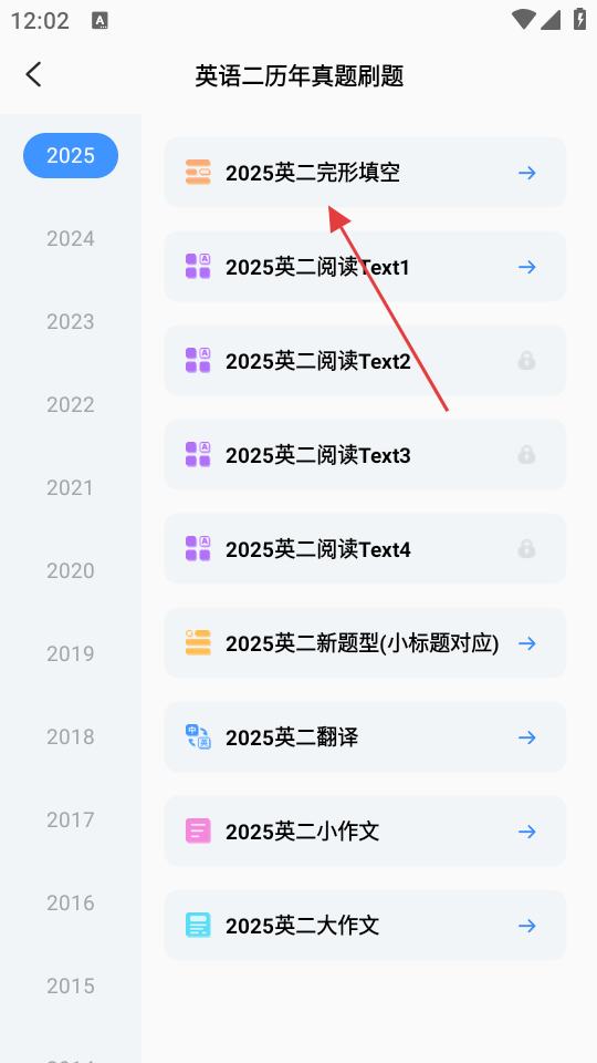3、在英语二历年真题刷题页面,点击【2025英二完形填空】,进入该题型的刷题界面。