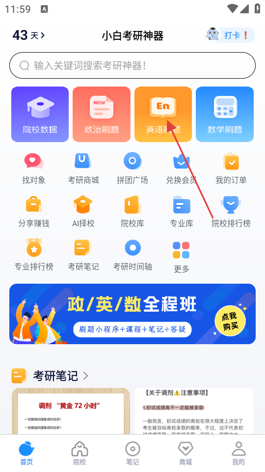 2、配备完善的题库系统,包含政治英语数学及专业课等科目,支持章节练习与模拟测试多种刷题模式。