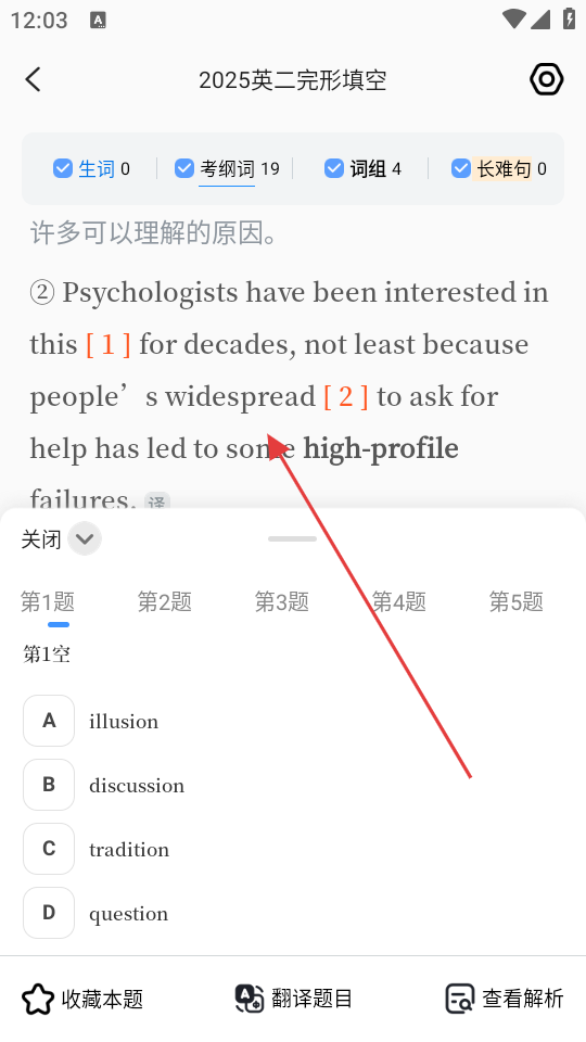 4、在2025英二完形填空刷题界面,可查看题目内容、选项,进行答题练习,还可收藏本题、翻译题目或查看解析。
