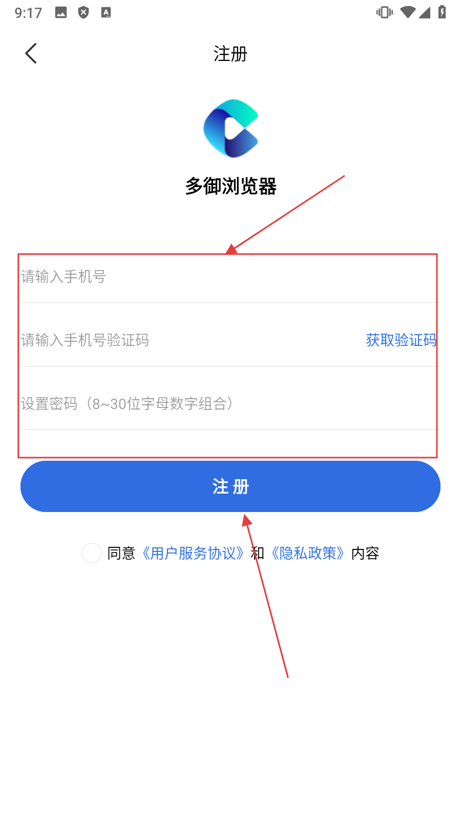 4、在注册页面,填写【手机号、验证码及密码】后点击【注册】,即可完成账号注册操作。