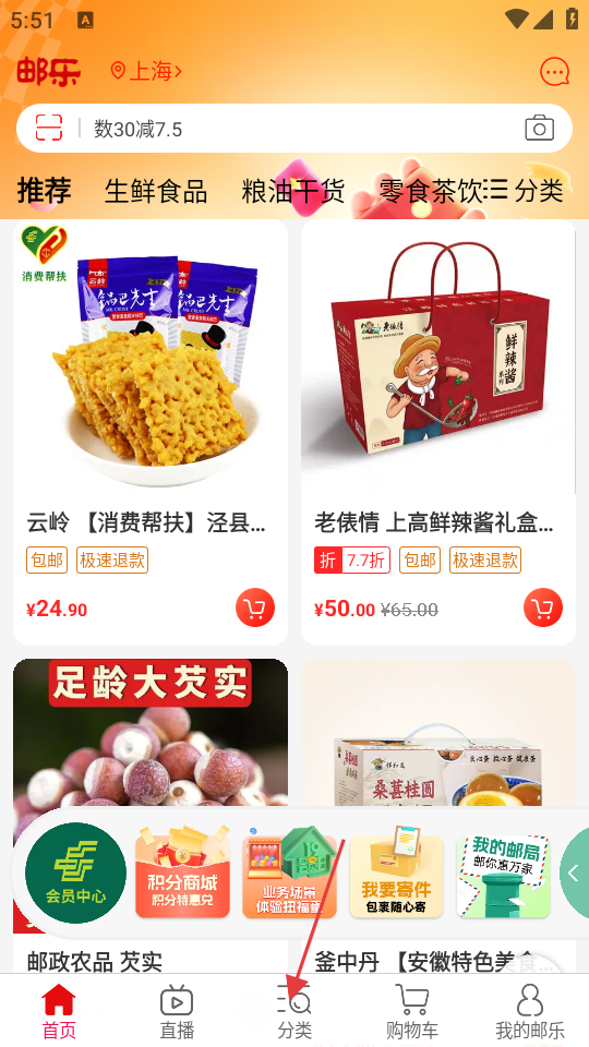 2、点击底部导航栏的【分类】选项,进入商品分类页面,可查看粮油调味、水果鲜花等分类。