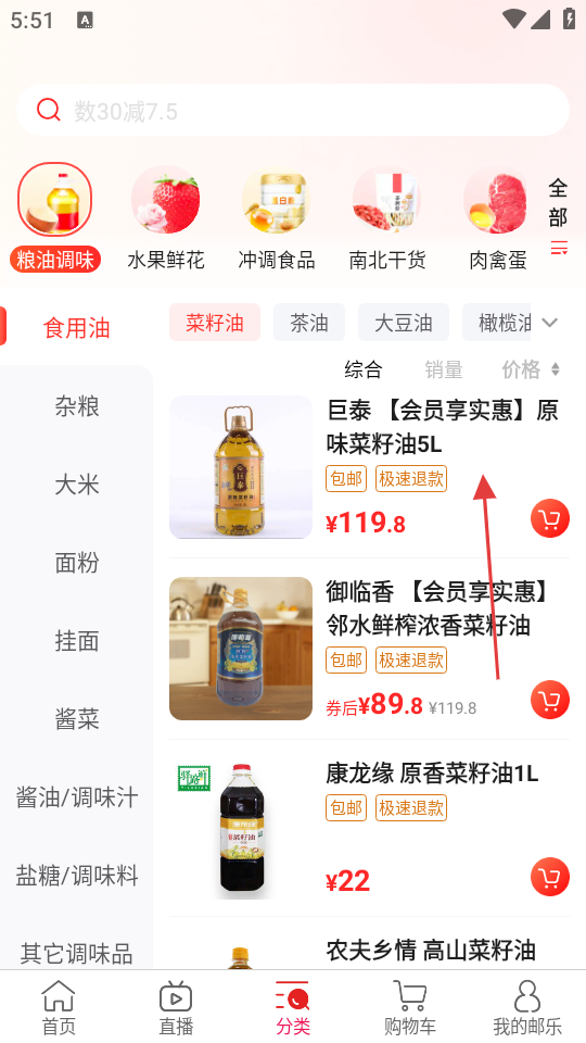 3、在商品分类页面的粮油调味分类中,点击目标商品,进入该商品详情页面。