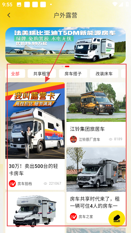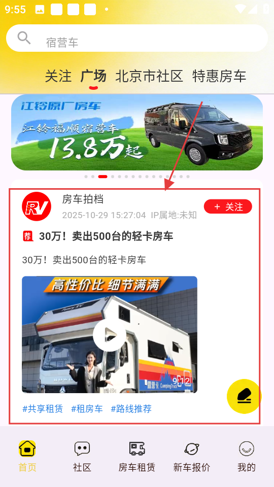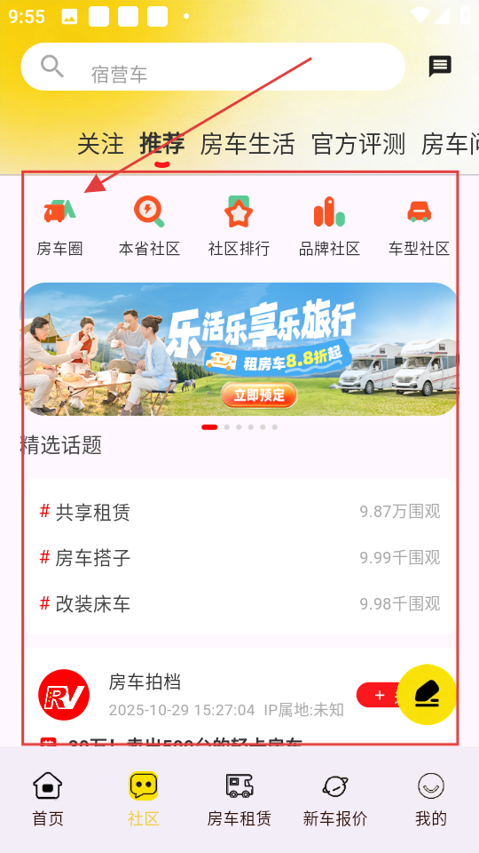 3、在社区页面,点击【房车圈】,可进入房车圈页面,浏览更多房车相关内容啦。