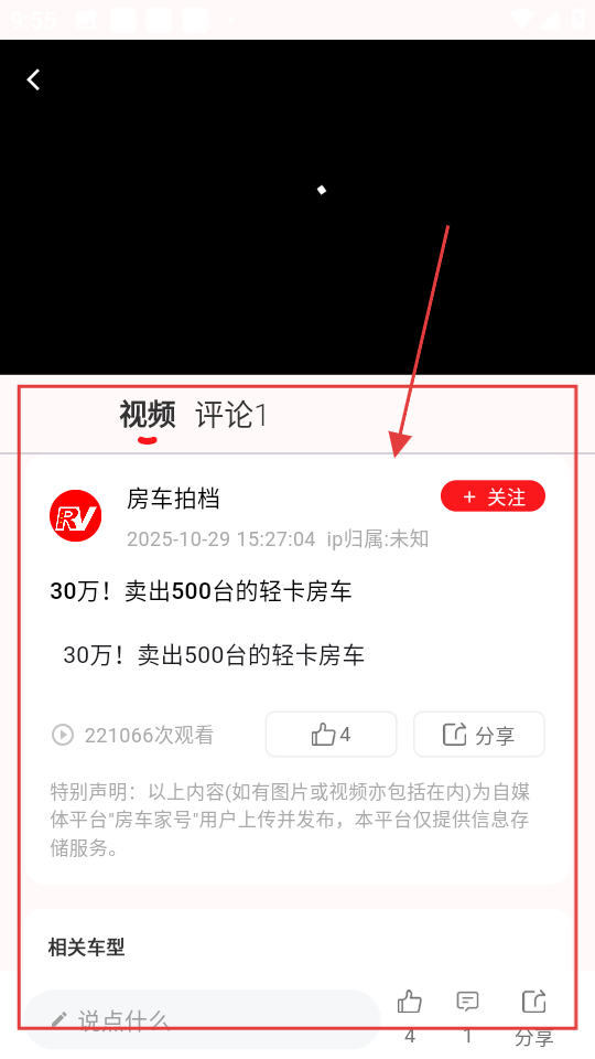 1、在首页,可浏览房车相关内容,点击感兴趣的房车资讯,进入详情页啦。
