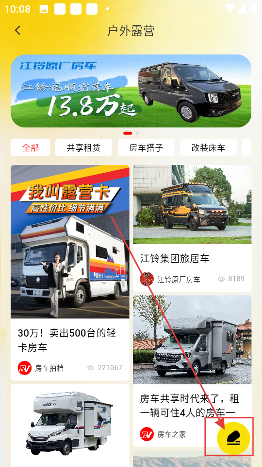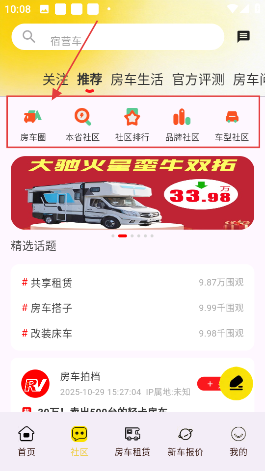1、点击【房车圈】,进入户外露营板块,可查看房车相关内容哦。