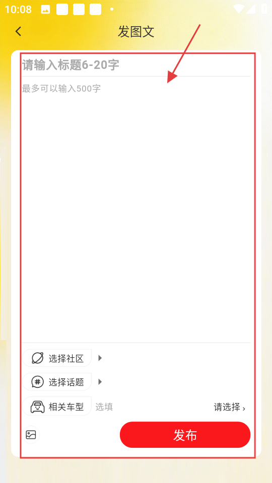 4、在发图文界面输入标题和内容,选择社区、话题等后点击【发布】,就能分享房车相关内容啦。